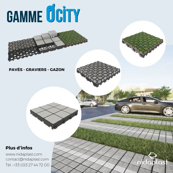 La dalle pavé appartient à la gamme Ocity constituée de deux dalles qui permettent de créer un ensemble stable, carrossable et mixte avec l’utilisation de matériaux de remplissage différents (pavés, graviers ou gazon).