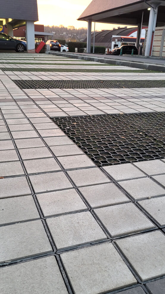 Chacune des deux dalles a été pensée et conçue pour répondre à plusieurs problématiques : la stabilisation des sols, l’intégration du végétal, l’esthétisme d’un aménagement mixte, la perméabilité et l’infiltration rapide des eaux pluviales.
