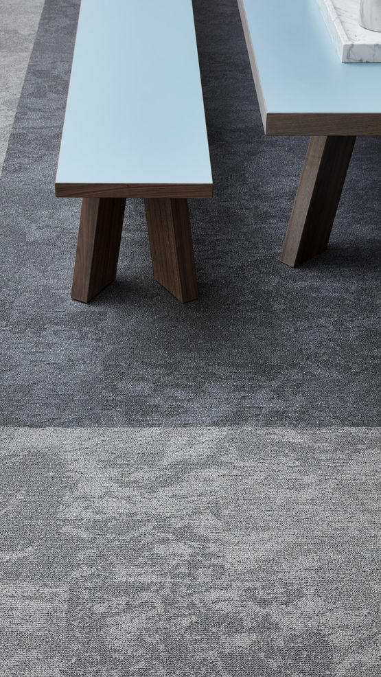 Fabriqués à base de velours bouclé structuré, ces revêtements de sol textile en dalle proposent une formule contenant au moins 75% de contenu recyclé défini positivement selon les critères C2C et SoundMaster, le velours étant à base de BCF PA6 et ECONYL.