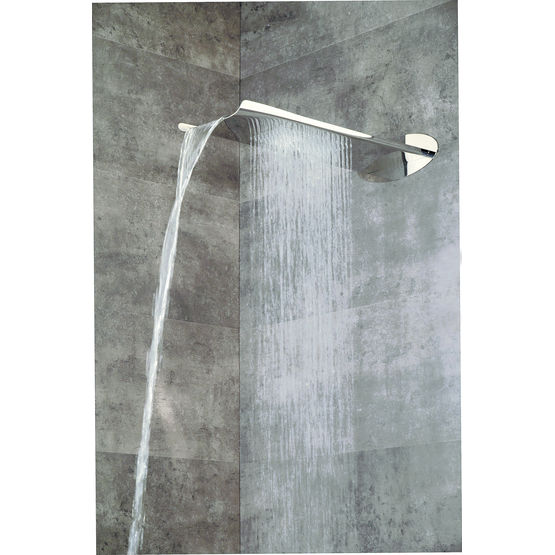 Douche de tête murale en acier inoxydable brillant. Dispose d’un bec plat de 56 cm de longueur et 20 cm de largeur offrant un jet pluie et/ou un jet cascade. Proposé avec un mitigeur bain-douche sur rosace avec inverseur ou un mitigeur pour douche sur rosace avec inverseur trois voies déporté.