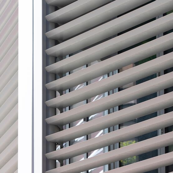 Lorsque les lames électriquement orientables sont fermées, la protection solaire est optimale. Les lames refermées et la surface de la façade sont alors alignées et constituent ainsi une unité parfaite.