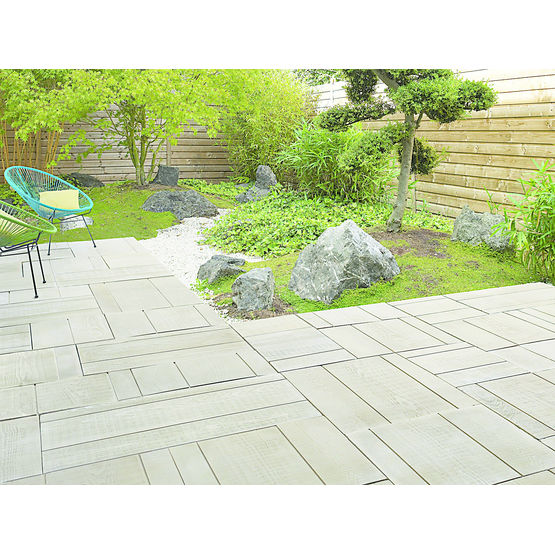 | Compléments de gamme : | dalle à motif inséré, lames avec ou sans coupe à l'onglet, pas circulaires et planches ou rebords pour entourage de végétation. |