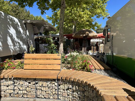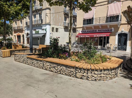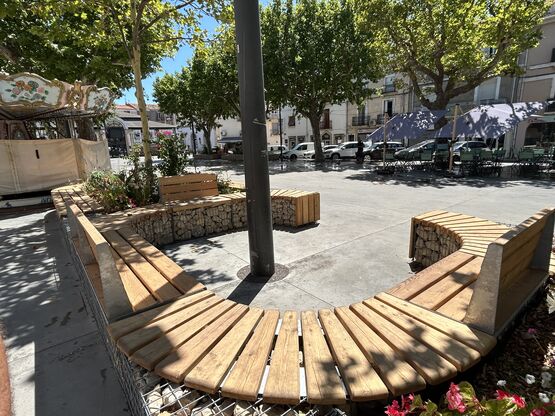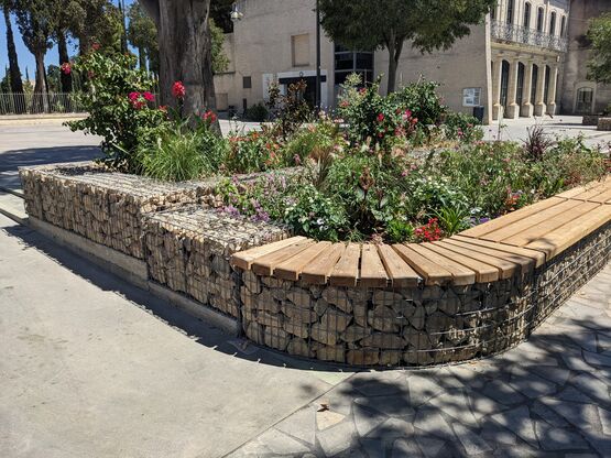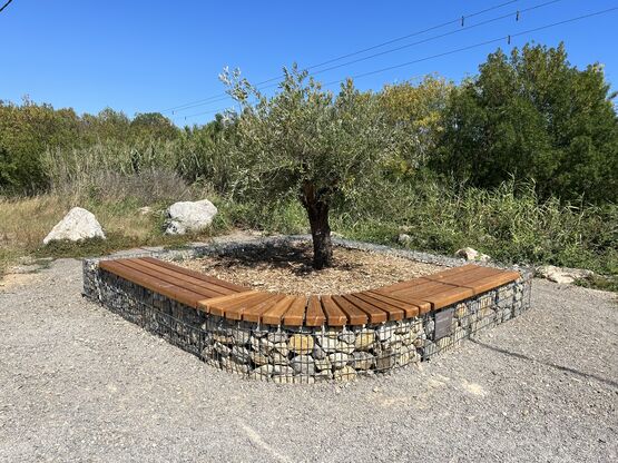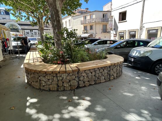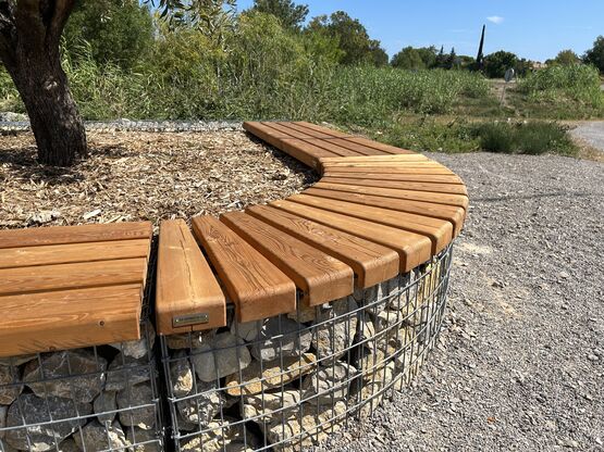 Entourage d'arbre / jardinière en gabion arrondie avec assise bois
