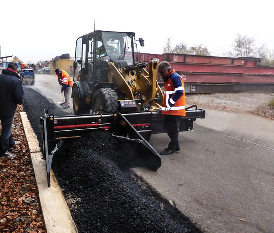 Les voiles latérales coulissent sur les surfaces existantes, tandis que l’épaisseur d’enrobé à étaler est réglable.