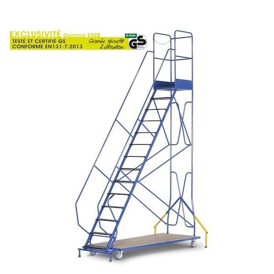 | Caractéristiques techniques : | - Escabeau roulant de 5 à 14 marches, - Escabeau mobile réduit de 2 à 5 marches, - Escabeau mobile réduit avec accès sécurisé de 2 à 5 marches, - Marche-pied alu de 2 à 3 marches, - Marche-pied alu avec garde-corps de 4 à 5 marches, - Marche-pied compact, - Marche-pied pour mise en rayon avec mains courants, version fixe et repliable, etc. |