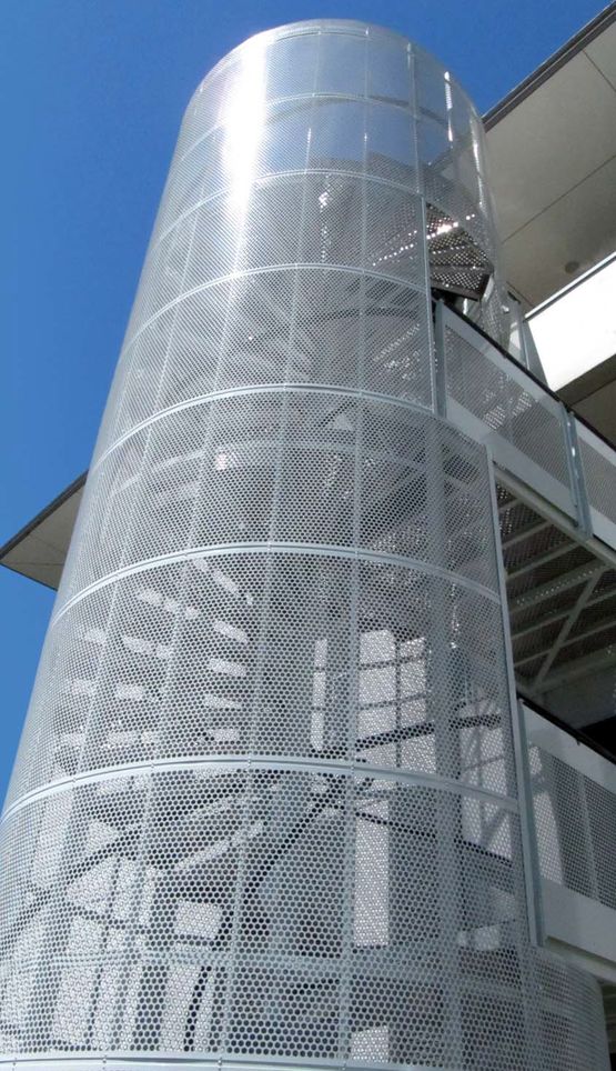 Grâce à des tôles Rythmic, cette solution escalier peut être animée par un éclairage artificiel ou naturel. Elle inclut, en outre, un palier conçu d’un plancher en tôle d’acier et d’une structure tubulaire en acier.