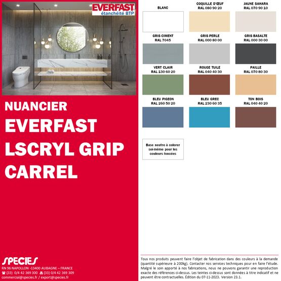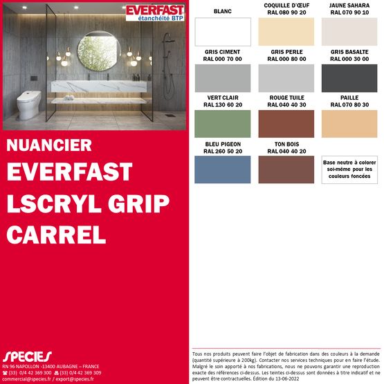 Le EVERFAST SCRYL GRIP CARREL décliné en plusieurs teintes (gris perle, gris basalte, blanc, coquille d’œuf, rouge tuile, jaune sahara, paille, vert clair, bleu pigeon, ton bois et base neutre à colorer pour les couleurs sombres), offre un séchage rapide en 2 heures.