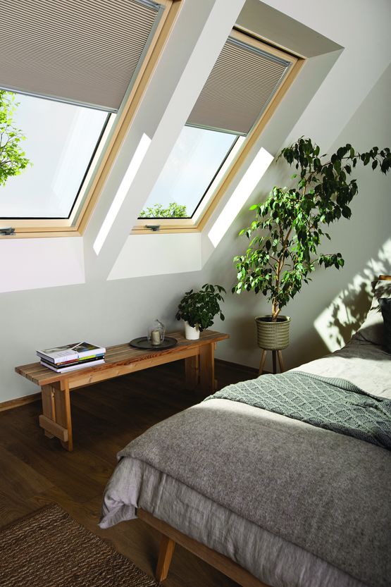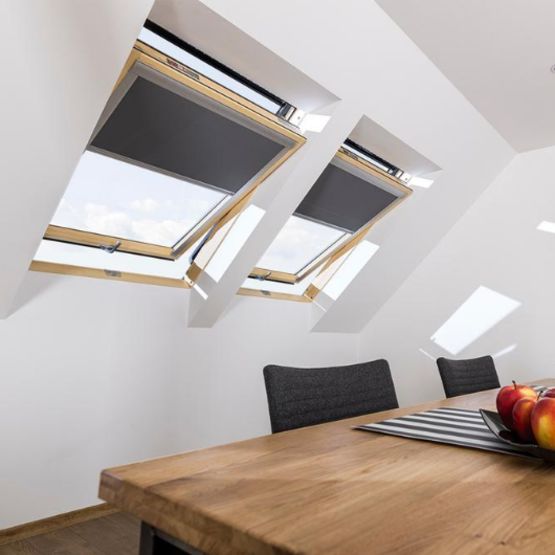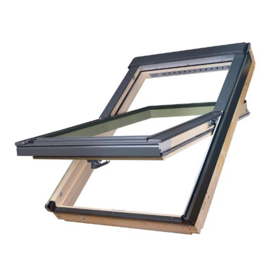 - Fenêtre pivotante en pin sylvestre verni destinée aux toits à pentes de 15 à 90°