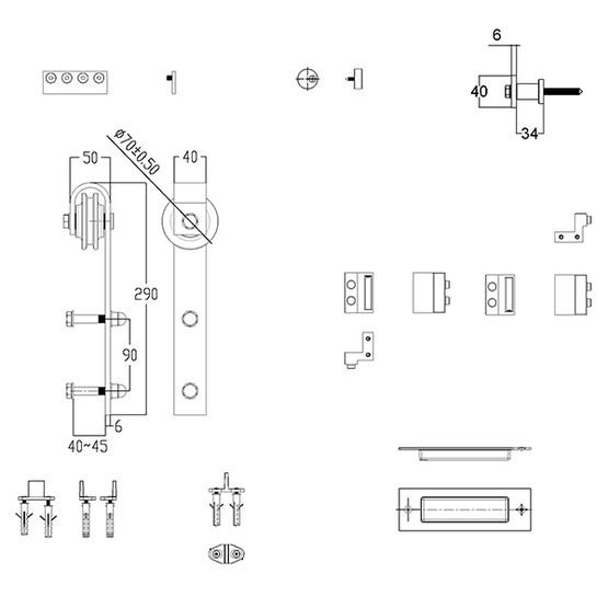 - 1 rail en acier trempé finition noir mat - Supports muraux en acier noir mat - 2 chariots en acier trempé finition noir mat (pour porte d’épaisseur 40mm min) - 2 butées de porte en acier trempé finition noir mat - 1 guide bas en nylon noir - 2 poignées cuvettes en acier trempé finition noir mat - 2 embouts de rail en acier trempé finition noir mat - 1 raccord de rail en acier trempé finition noir mat (pour double portes) - Diverses fixations |