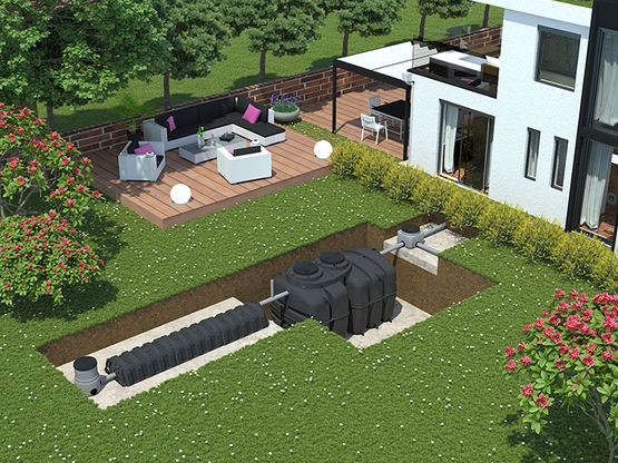 - Installation dans une fosse étanchée par géomembrane avec matériaux filtrants et drainants : graviers, sable, géogrille