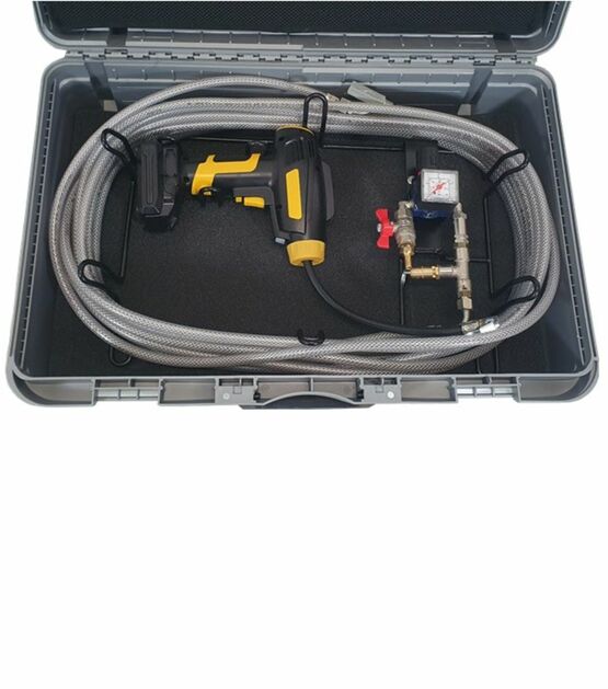 Monté sur son support, ce kit de test d'étanchéité est constitué d'un flexible d'une longueur de 15 m, d'un support de ballon, d'une connexion pour montage des cannes 12x175, d'un manomètre, d'un régulateur de pression et d'une soupape de sécurité tarée.