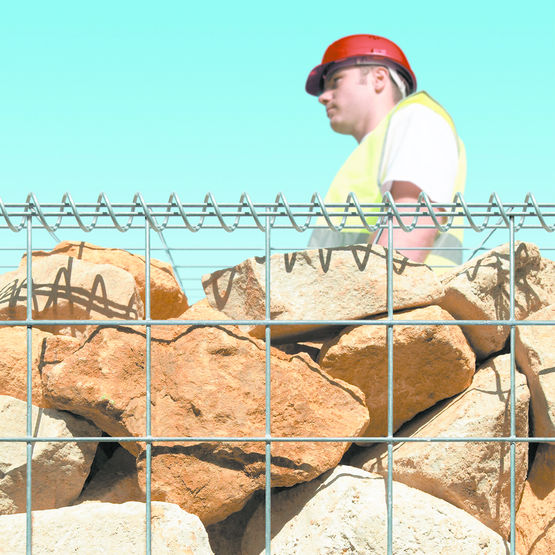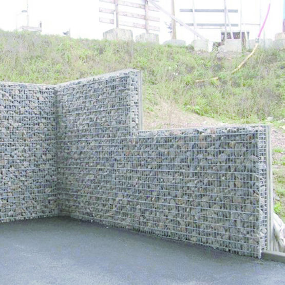 | Mise en oeuvre : | montage des cages par agrafage ou ligature ; pose sur assise nivelée avec géotextile, coffrage au niveau du parement vu par cadres de guidage ; remplissage à la pelle mécanique avec matériau non gélif et non friable de granulométrie adaptée au maillage ; manutention conçue par le fabricant (sangles et palonnier) pour mise en place éventuelle dans l'eau de gabions matelas pleins. |