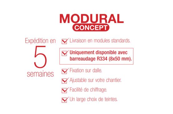 Ce garde-corps modulaire est livré en modules standards de 1468 mm qui se raccordent entre eux et s'ajustent aux dimensions du chantier par simple recoupe et est disponible uniquement avec le barreau R334 (8 x 50 mm) ainsi qu’avec un large choix de teintes.