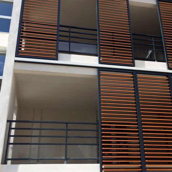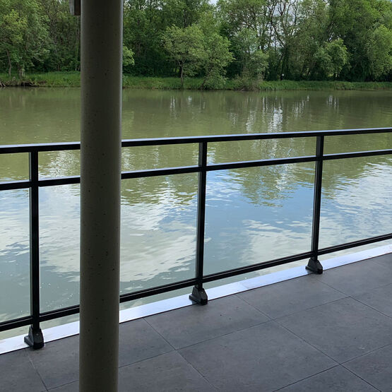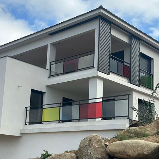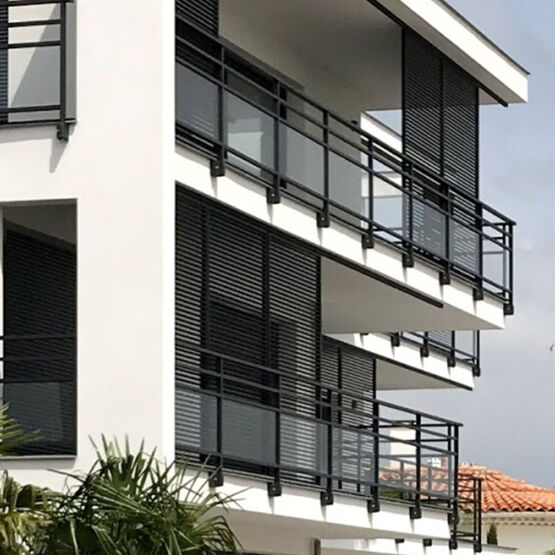 Avec sa structure solide et robuste, en aluminium barreaudé et axé, cet élément offre une esthétique épurée et contemporaine. Il se compose de panneaux de verre feuilleté 44.2, transparents ou teintés, et d’une main courante rectangulaire ou ronde.