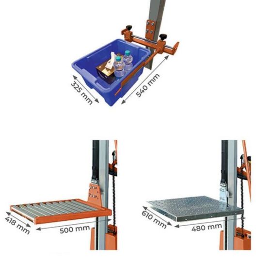 | Caractéristiques techniques : | Élévation à vide (cm/s): 11 Levée électrique jusqu’à 180 cm Batterie (V/Ah) : 100 et 150kg = 24/ 7 ou 250kg = 2 x 12/20 |