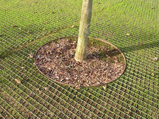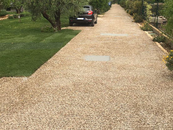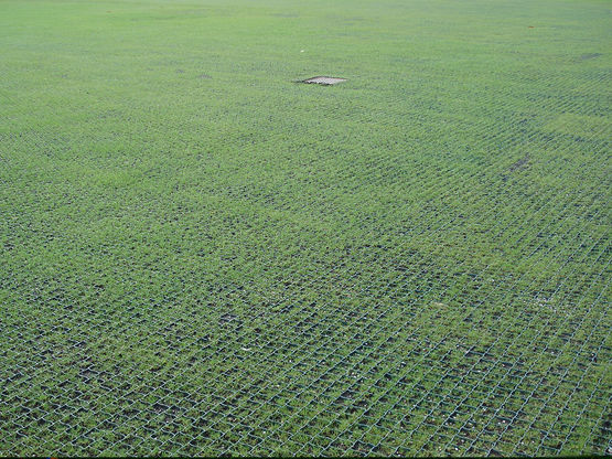 Le principe consiste à armer la superficie naturelle du terrain avec des grilles à structures cellulaires très solides dans lesquelles les mottes de gazon restant au-dessous des parois verticales du dallage de quelques mm sont protégées de l’écrasement.