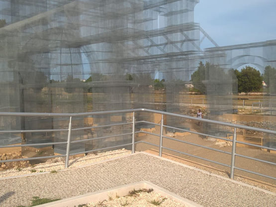 La forme recourbée améliore considérablement la résistance des parois verticales en compression et en flexion. L’impression esthétique agréable qu’offre cet aspect cache une structure d’une importante valeur; lors de la conception il a été prévu d’optimiser les prestations du dallage en réalisant des parois en «s» le long des parois droites, pour reproduire l’ «effet arc». Cela permet, d’une part, d’absorber et répartir plus efficacement les forces développées par une voiture en accélération ou en freinage qui se déchargent brusquement sur la tête des sections des parois, de l’autre, cela permet d’augmenter sensiblement la portée des charges verticales à égalité de superficie de la structure. »