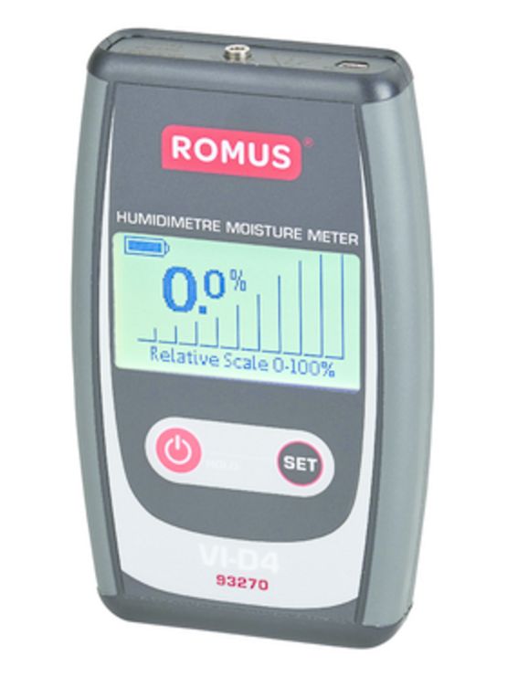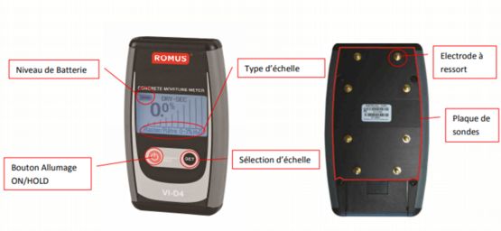 Fourni avec 2 piles LR6 et housse de protection, l’indicateur d'humidité pour planchers en béton VI-D4 dispose d'électrodes à ressort reliées à une plaque de sondes, d’un afficheur monochromatique avec 4 échelles et d’une ceinture en caoutchouc antidérapante et antichoc incorporée.