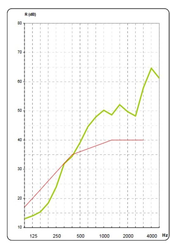 | Indice d'affaiblissement acoustique aux bruits aériens (Rw) : | 45 (-5 ; -13) dB (plateau 0,75 mm, isolant 130 mm et profil 0,63 mm) à 48 (-8 ; -17) dB (plateau 0,75 mm, isolant 130 mm, omega 20 mm et profil 0,75 mm). |