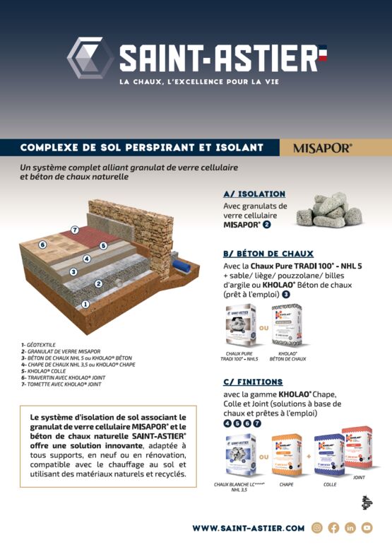 Grâce à sa structure minérale, MISAPOR combine trois fonctions clés en une seule couche : isolation thermique du sol, rupture capillaire limitant les remontées d’humidité, et perméabilité à la vapeur d’eau permettant de conserver des complexes de sols perspirants (dalle/chape à la chaux, finitions respirantes).
