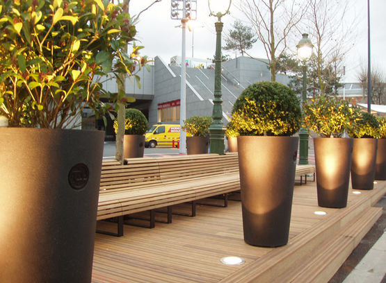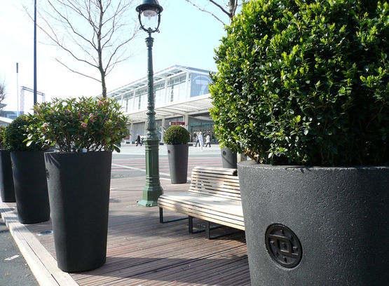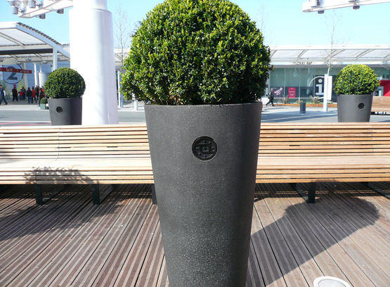 Proposé en diverses couleurs et dimensions, cet élément pour des agencements extérieurs peut être fourni avec une variété d’options : traitement anti-graphiti, anneaux intérieurs, réserve d’eau, coupelle de récupération d’eau, intégration de motifs ou d’écussons, etc.