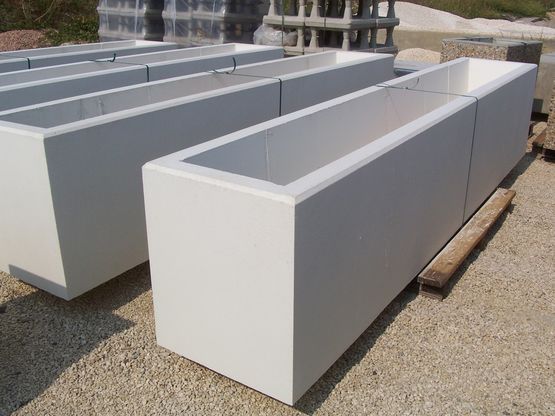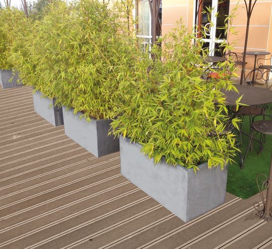 Avec près de 40 modèles différents, PBM propose des jardinières résistantes, aux tailles variées, en finition béton gris ou béton blanc.