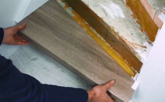 Ce kit de rénovation utilise l’escalier d’origine comme base pour les nouvelles marches, découpées une à une en fonction de ce modèle, puis collées.