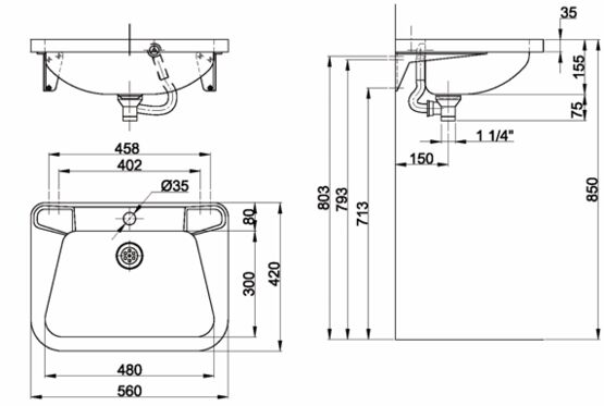 - Dimensions extérieures : L 560 x P 420 x H 150 mm / Vasque : L 480 x P 300 x H 150 mm