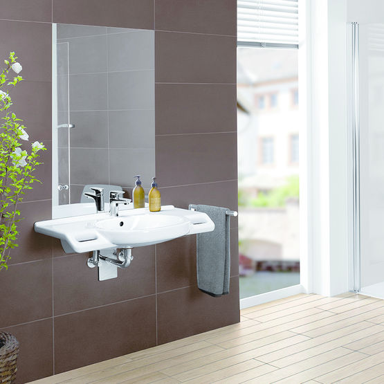 Dotée de poignées ou de rainures de préhension, cette gamme de lavabos simplifie l'approche en fauteuil roulant et offre une bonne stabilisation. Disponible en 3 largeurs, jusqu'à 80 cm, sans trou de robinetterie ni trop-plein pour une meilleure hygiène. Complétée par différents modèles de cuvettes suspendues et sur pied avec siège rehaussé ou rallongé et abattants à rebord de préhension, cales spéciales ou traitement antibactérien. En option, système de fixation sans brides (DirectFlush). Adaptée aux logements PMR.