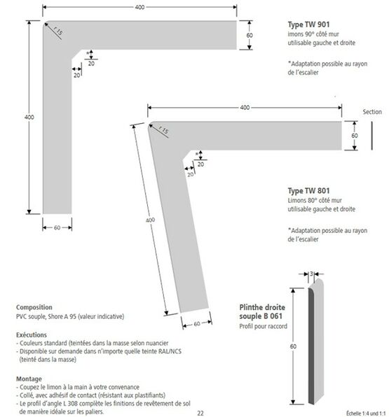 | Caractéristiques techniques : | Forme de marche d’escalier de 90° ou 80° |