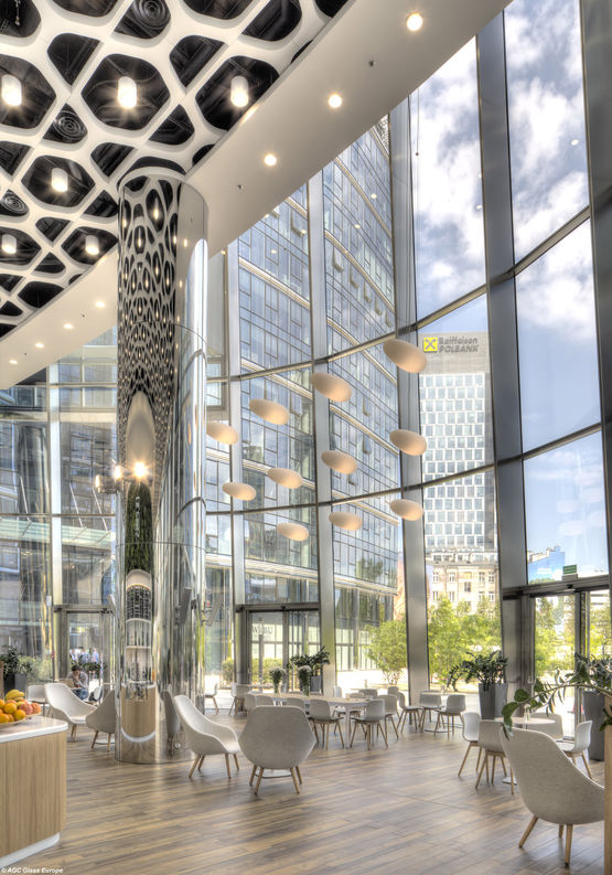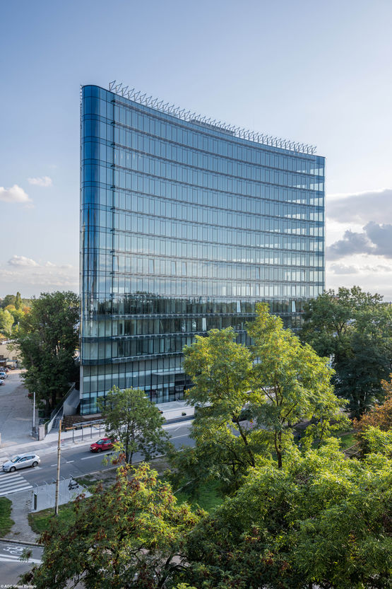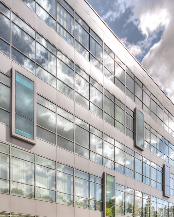 Parfaitement adapté pour une installation sur un mur-rideau ou en menuiserie parclosée, ce verre à couche a été créé pour pouvoir être trempé thermiquement ou être bombé pour épouser les formes données aux bâtiments.