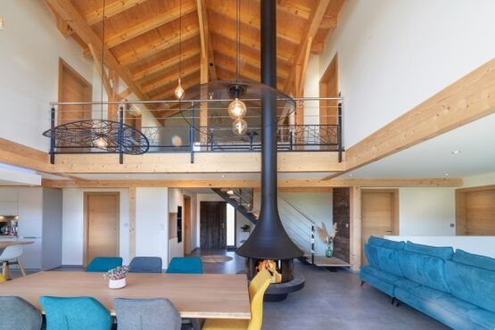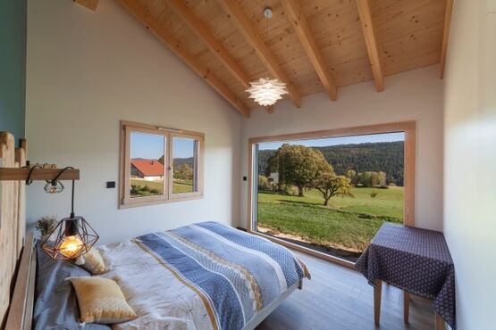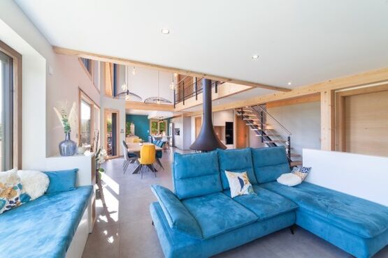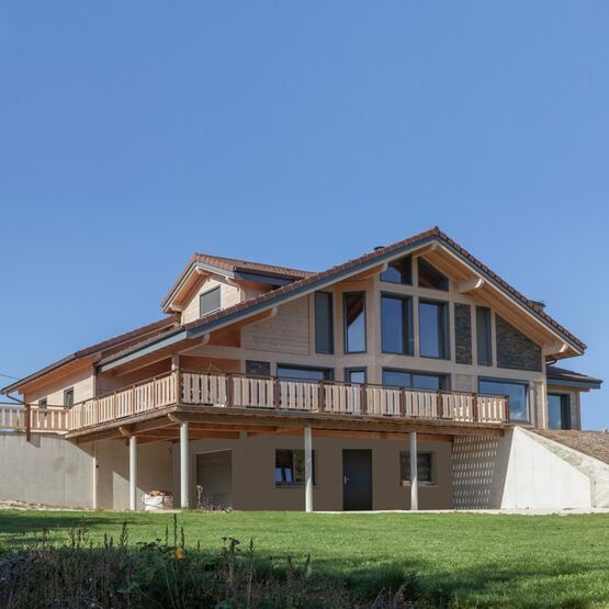 Grâce aux grandes ouvertures sur l'espace séjour et la mezzanine, ce logis garantit une bonne luminosité dans les diverses pièces et permet de profiter du paysage extérieur. Réalisé à partir de bois madrier, il garantit une haute stabilité dimensionnelle, un confort thermique naturel, une écologie et une durabilité environnementale.