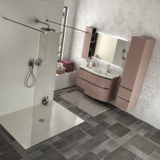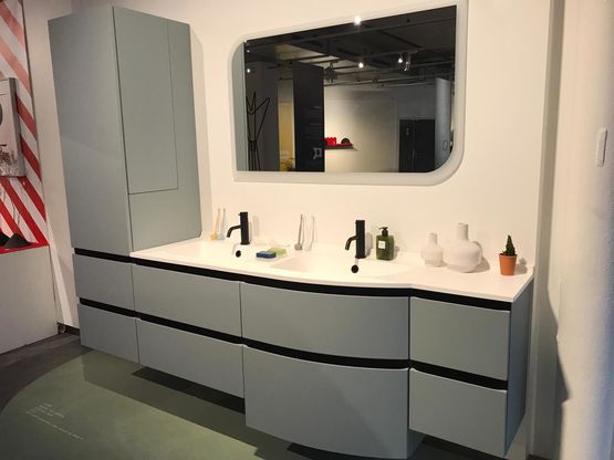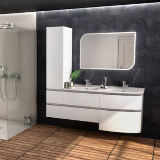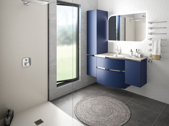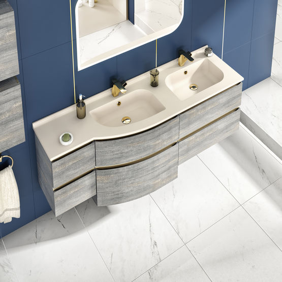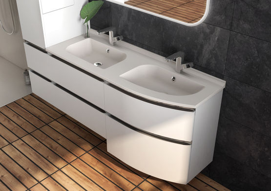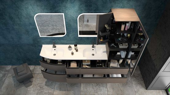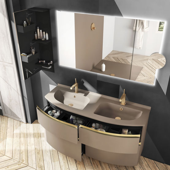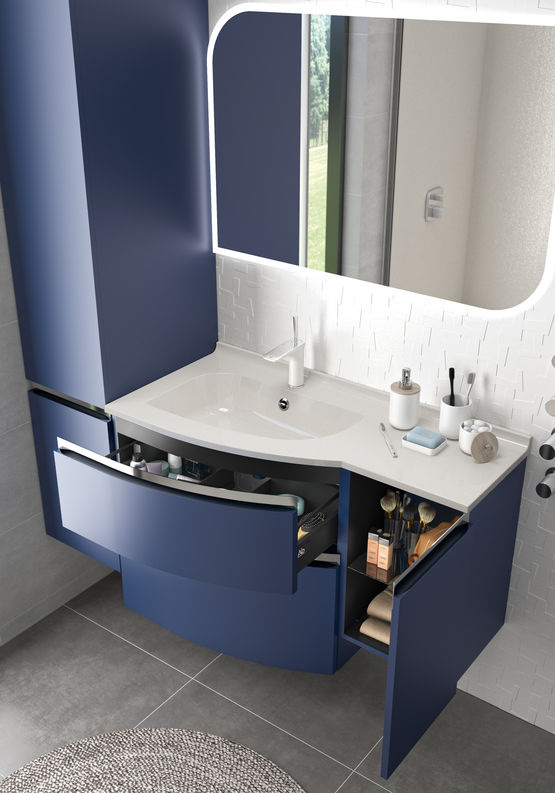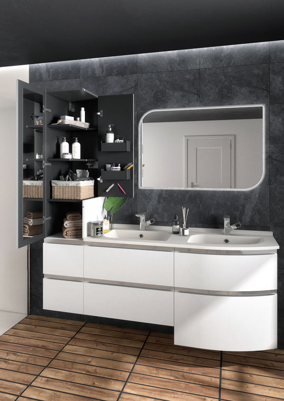 Les courbes élégantes du meuble de salle de bains Aviso dissimulent de vastes rangements et des accessoires d'une grande praticité.