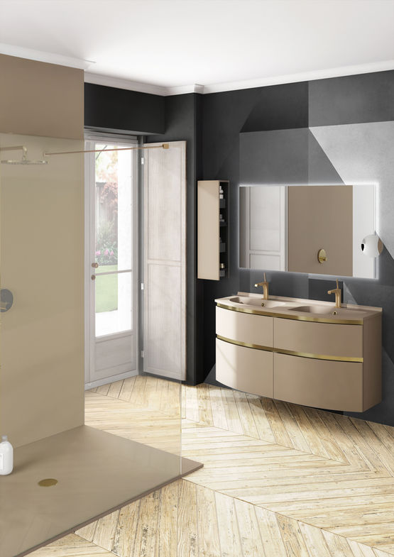 La ligne du profil prise de main souligne le plan de toilette et suit la courbe des tiroirs sous vasque. Il est disponible en 3 coloris (chromé, noir mat et or brossé) de façon à pouvoir l'assortir avec votre robinetterie.