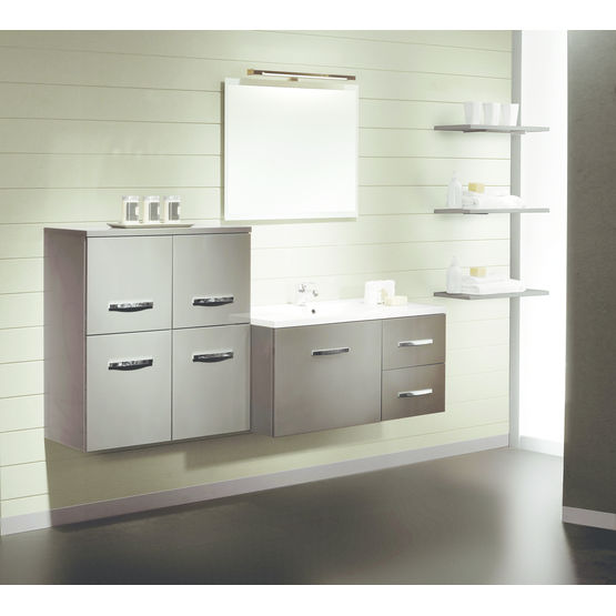 - Meubles en mélaminé à façade laquée blanc ou gris.