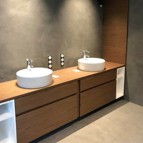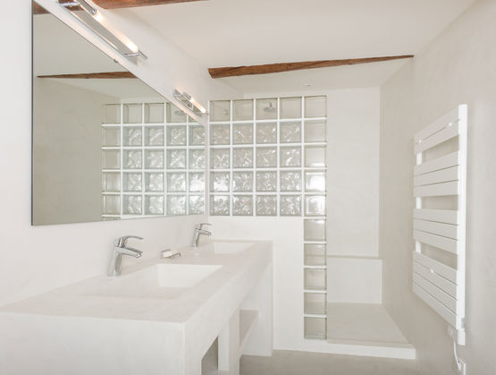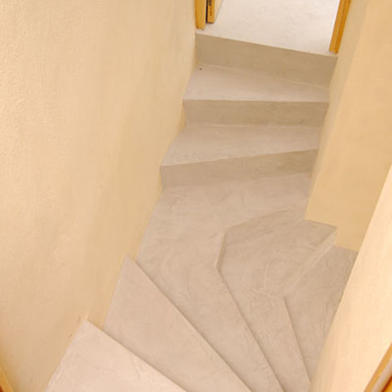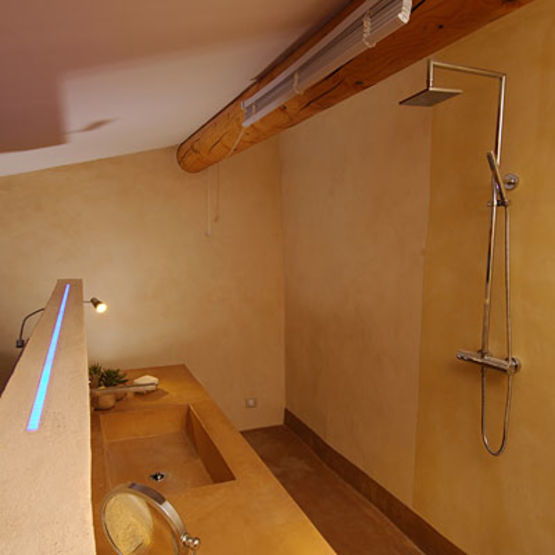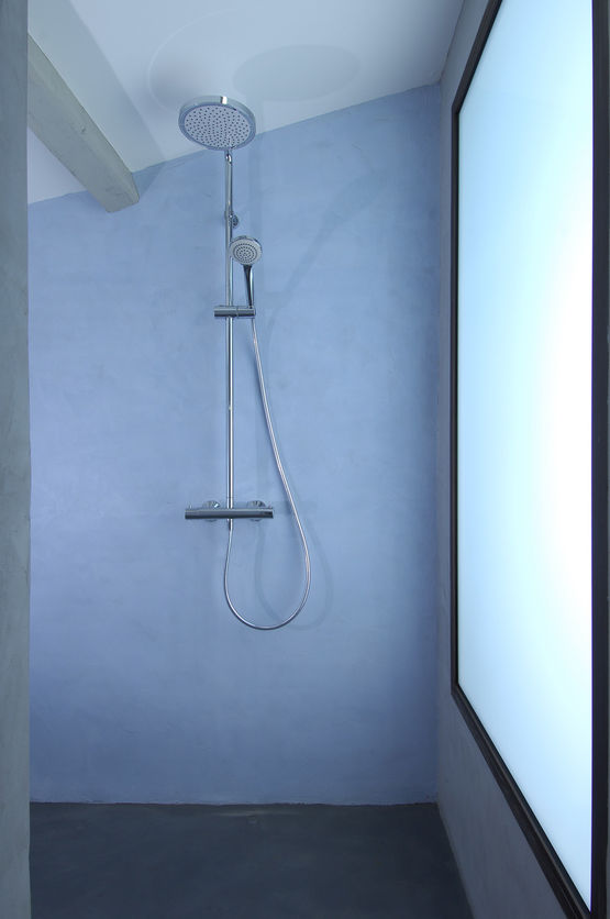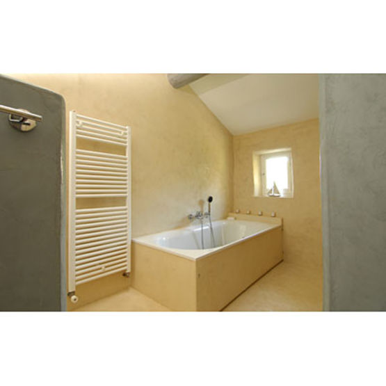 Le même produit s'utilise dans toutes les pièces de la maison : salle de bains, douches à l'italienne, cuisine, pièces à vivre, sols y compris sur plancher chauffant, escalier. Il s'utilise également dans des espaces à fortes contraintes : hammams, spas, saunas. Il se décline en 72 teintes.