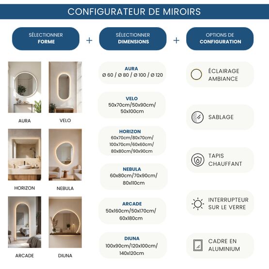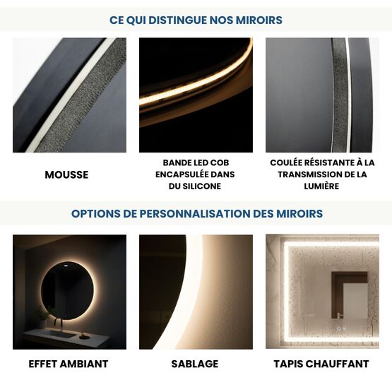 Il peut être équipé d’un rétroéclairage LED à effet halo, d’un sablage décoratif, d’une fonction anti‑buée grâce à un tapis chauffant, ainsi que d’un variateur permettant de rendre l’éclairage LED dimmable.