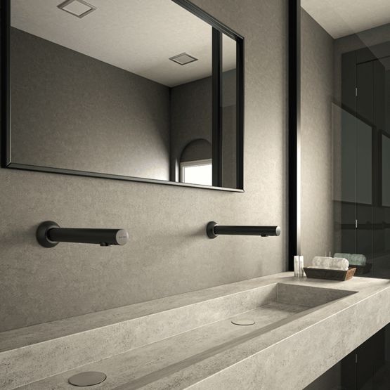 Pouvant enrichir tous les agencements de salles d’eau et salles de bain, ce mitigeur de lavabo est caractérisé par un corps en laiton chromé de finition en chrome noir mat et un boîtier électronique IP65.