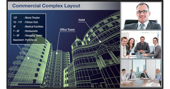 Il suffit de simplement connecter une clé USB au lecteur USB multimédia intégré ou un ordinateur via la borne D-SUB, pour visualiser votre contenu. Il assure également un affichage continu pendant les horaires d'activité pour un usage 16/7.
