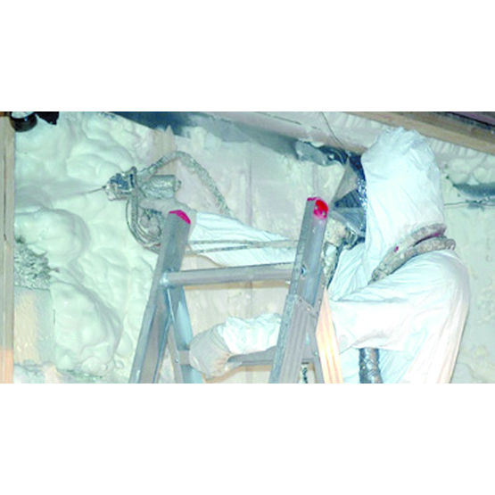 | Mise en oeuvre : | projection sous pression (70 à 110 bars) par pistolet airless, entre 49 et 71 °C ; découpe du surplus, puis pose de cloison sèche ou autre finition en intérieur ; pose d'un pare-pluie et habillage de façade avec lame d'air de 3 cm en extérieur ; ventilation mécanique contrôlée du bâtiment recommandée. |