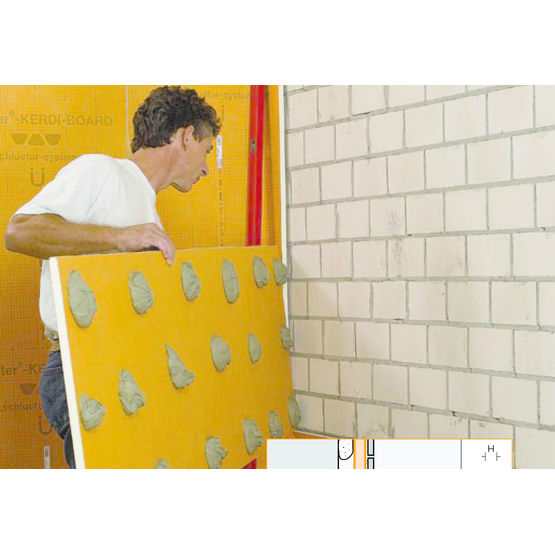 | Mise en oeuvre : | fixation par vis, chevilles à frapper ou par mortier colle (en plein ou sur plots) selon la planéité et la nature des surfaces murales existantes ; étanchéité des angles et joints entre panneaux par recouvrement de bandes (KERDI-KEBA) posée à la colle (KERDI-COLL) ; découpe au cutter; réalisation possible d'habillages (canalisation, gaine, baignoire, etc.). |