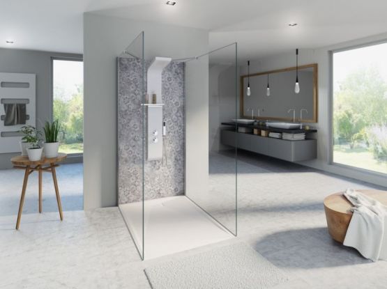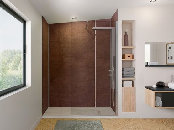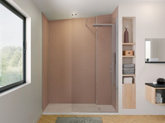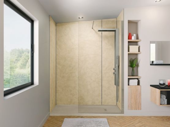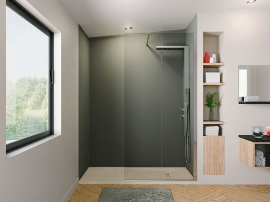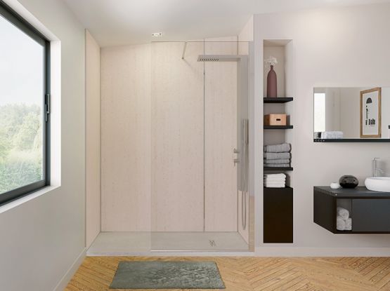 Courte, découpable et perçable, la gamme KINEWALL DESIGN est adaptée à un montage facile et rapide en niche ou en angle grâce aux kits d'installation, avec la possibilité de mixer les panneaux entre eux selon les envies. Une corniche de finition blanc mat est disponible en option permettant d’atteindre 250 cm pour les panneaux de 224 cm.