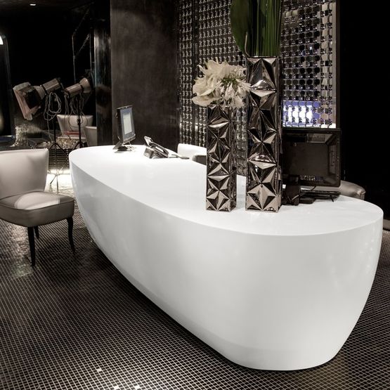 1. Esthétique sur mesure : Les panneaux Corian® se prêtent aisément à la découpe, à l'assemblage et au thermoformage, permettant la réalisation de designs personnalisés et de formes uniques. Cette flexibilité facilite la création d'ambiances uniques, intégrant par exemple des systèmes de rétroéclairage pour une touche lumineuse sur mesure.