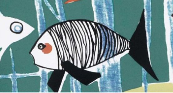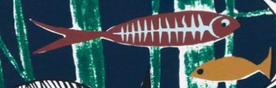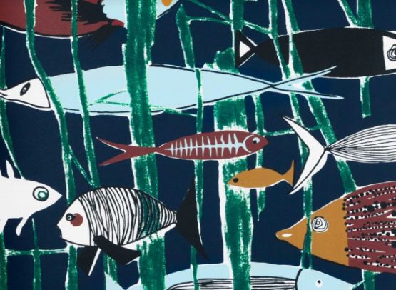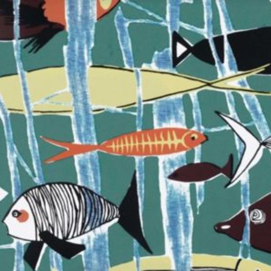 Très moderne en raison de ses couleurs et motifs poissons de différentes tailles et formes, le tissu non-woven est large de 70cm et peut être coupé au raccord.