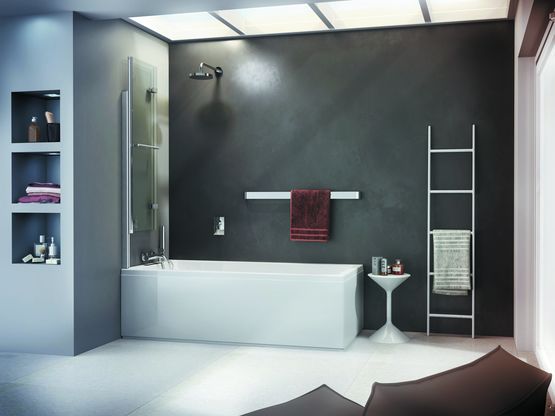 Le pare baignoire IRIO 90 EPURE est proposé en 140 cm de hauteur, en 90 cm de largeur et en deux finitions : blanc brillant ou argent brillant satiné.