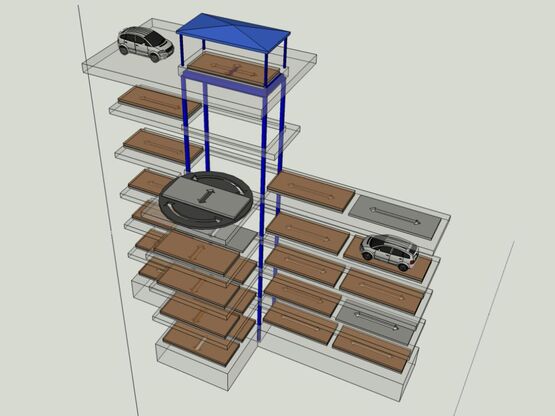 - Système de parking permettant la juxtaposition et la superposition, sur deux ou trois niveaux, de tous types de véhicule. Plateformes se déplaçant transversalement via des rails d’entraînement et de guidage, et verticalement via des vérins hydrauliques.