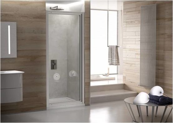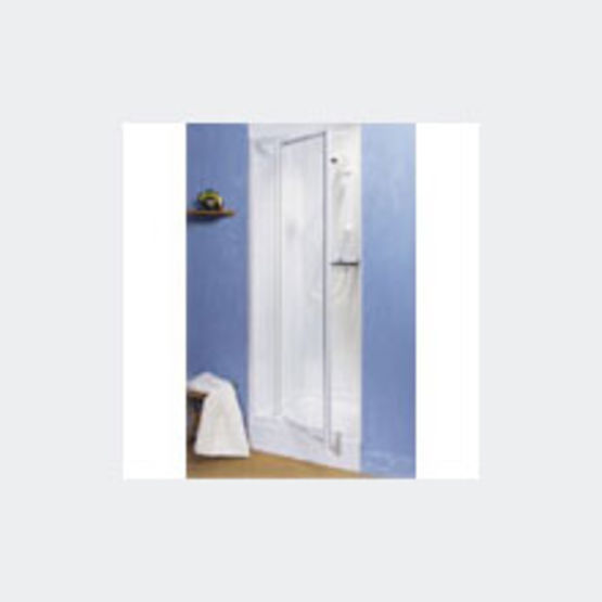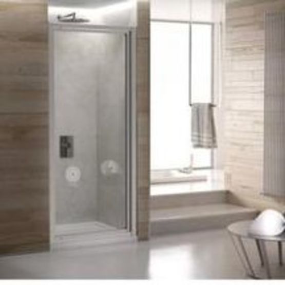 La paroi de douche FORDHAM avec porte pivotante est fabriquée en verre clair avec une finition marquante blanc brillant ou argent brillant satiné.