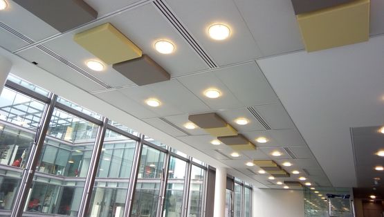 Grâce à leur vaste gamme de couleurs standards, on peut obtenir des conceptions dynamiques et des jeux de reliefs aux plafonds tout en bénéficiant d’une remarquable réduction des temps de réverbération.