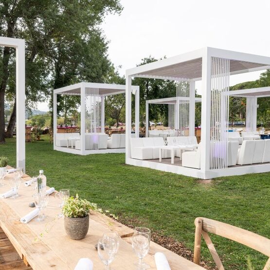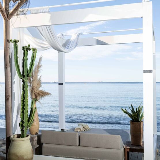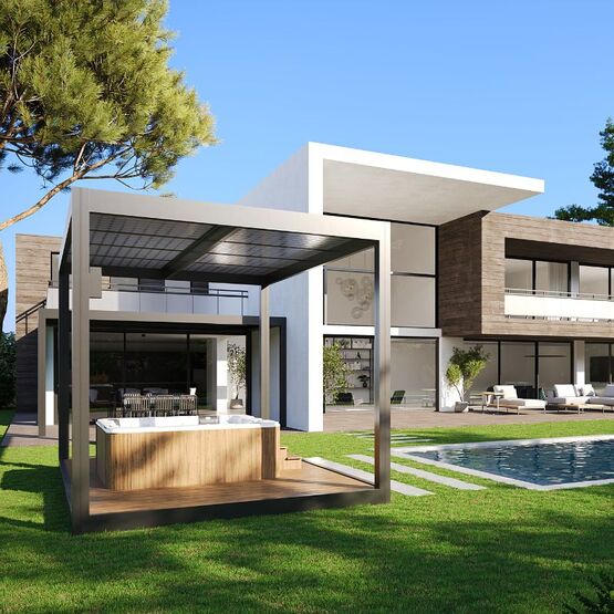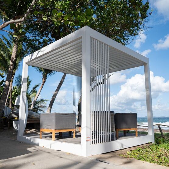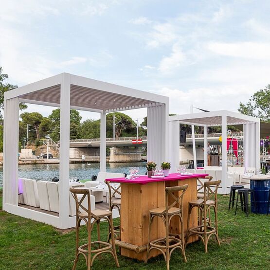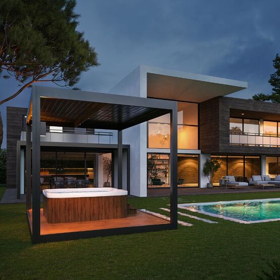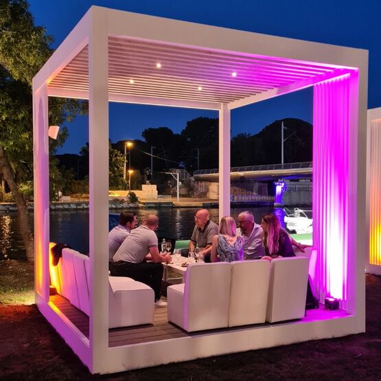 Accompagné de spots LED et compatible avec l’installation de sonorisation, ce « box » est bien plus qu’une pergola ; il devient un réel atout décoratif de jour comme de nuit.