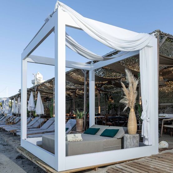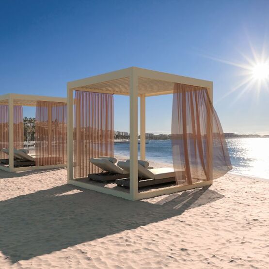 L’objectif : proposer un abri unique, à la fois léger et sophistiqué, qui remplit sa fonction protectrice tout en apportant caractère et originalité. Son format et sa configuration lui permet ainsi de s'adapter parfaitement à n’importe quel projet qu’il soit pour un particulier ou pour du tertiaire (restaurant, hôtel, plage privée.).